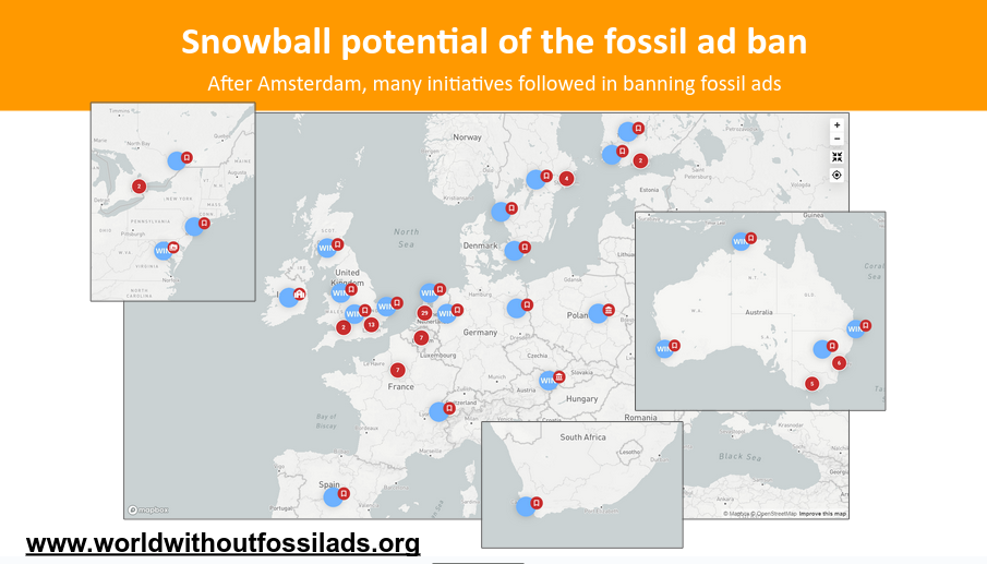 Amsterdam was de 1e gemeente ter wereld die afstapte van fossiele reclames. Daarna volgden gemeenten in oa Nederland, Australië, het VK en Scandinavië.