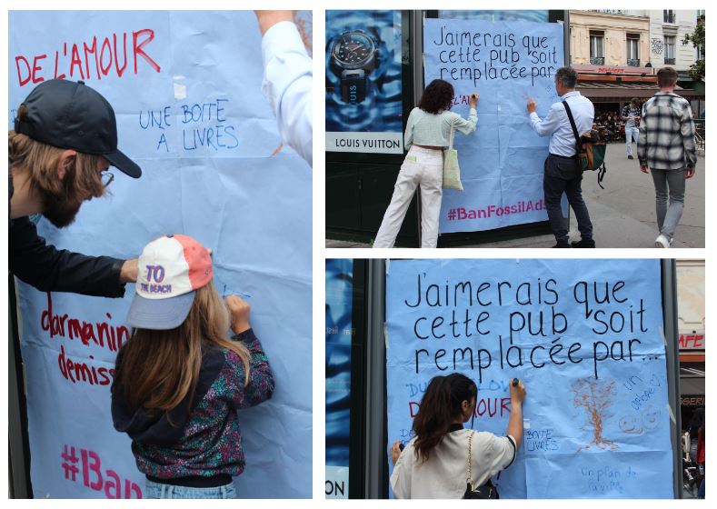 Met een leeg vel, wat tape en stiften gaan we reclames in de openbare ruimte bezoeken, tijdelijk afplakken en omtoveren tot een creatief tekenblok voor voorbijgangers. Met de vraag ‘Wat zou je hier willen zien in plaats van een reclame?’ vragen we aandacht voor de ruimte die reclame krijgt in onze openbare ruimte. Dit levert leuke, positieve reacties op en een interessante opening voor een praatje over onze campagne. Zie de afbeeldingen hieronder voor een sfeerimpressie van zo’n actie in Parijs eerder dit jaar.