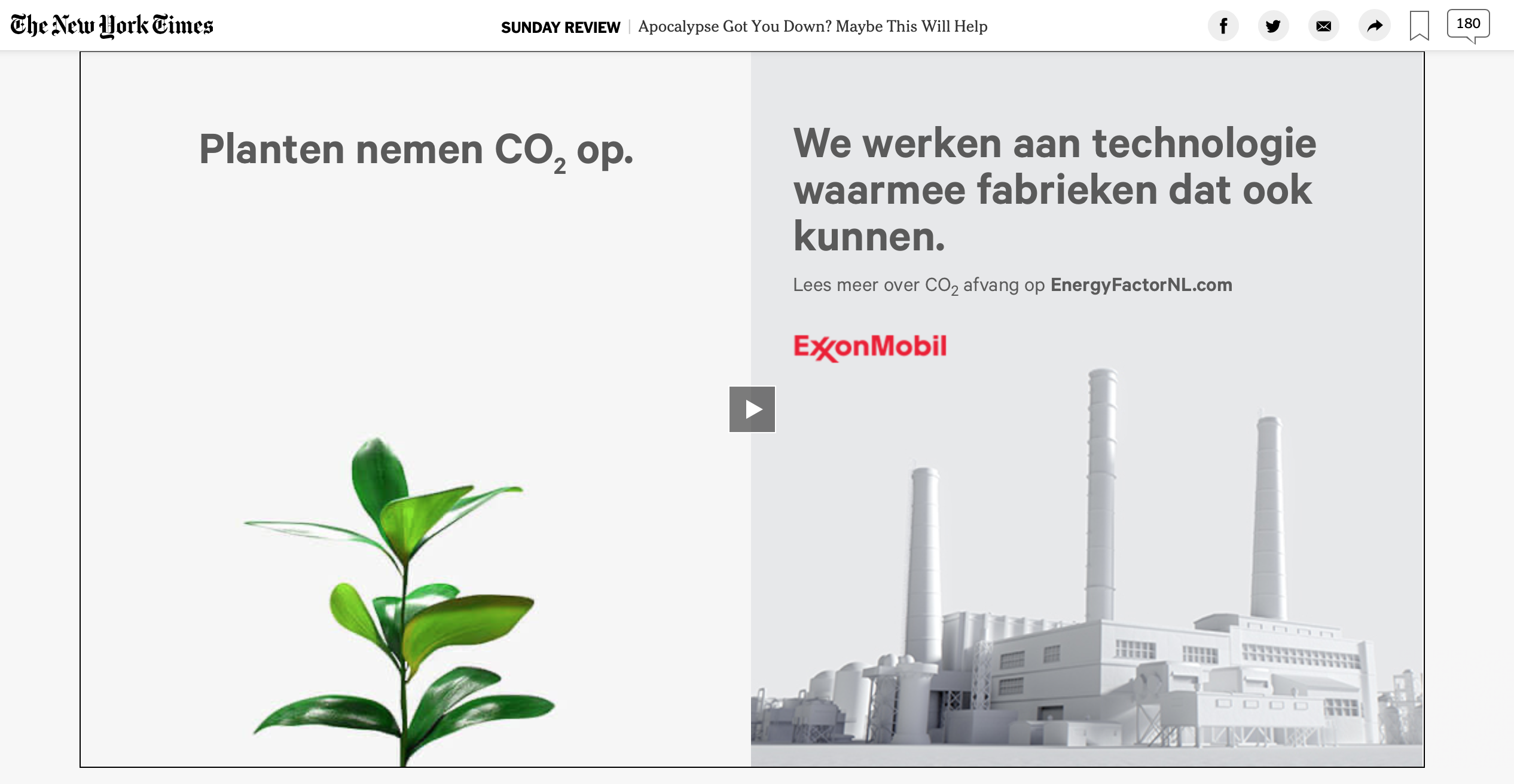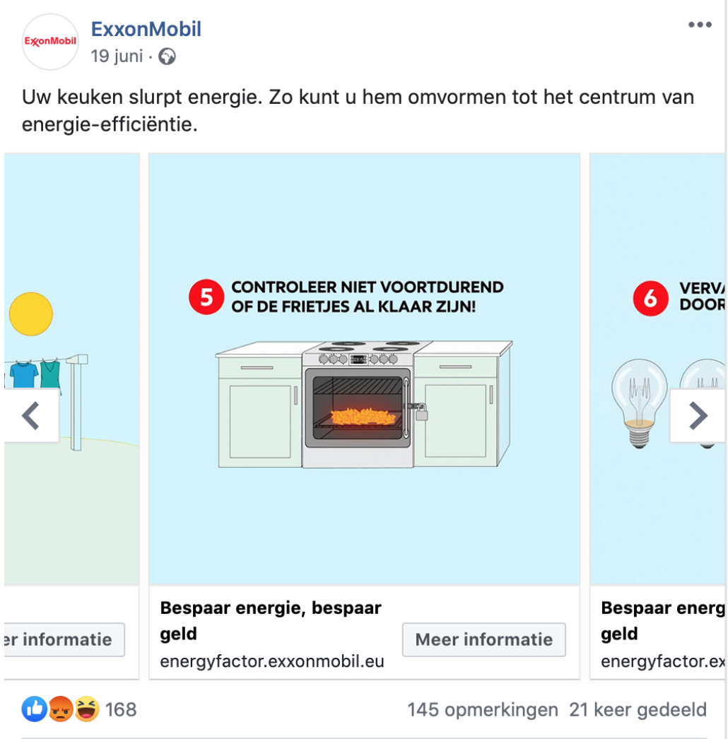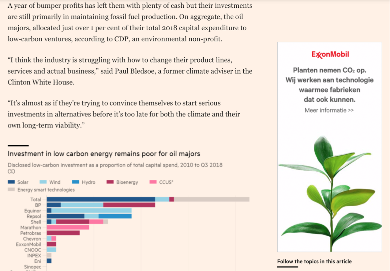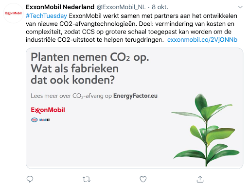 Effect: Tempo en koers klimaatbeleid bepalen om markt te beschermen Dankzij het rookgordijn van misleidende reclame, houdt de fossiele industrie invloed op de politiek. Zo kunnen Shell, Exxon en BP tempo en koers van klimaatbeleid naar hun hand zetten. Zo pleit de fossiele industrie voor een ‘realistische’ (lees trage) transitie met keuzes die winst opleveren voor de fossiele industrie: aardgas, restwarmte, CCS en in stand houden van de fossiele subsidies t.w.v. € 7.6 miljard per jaar in Nederland.