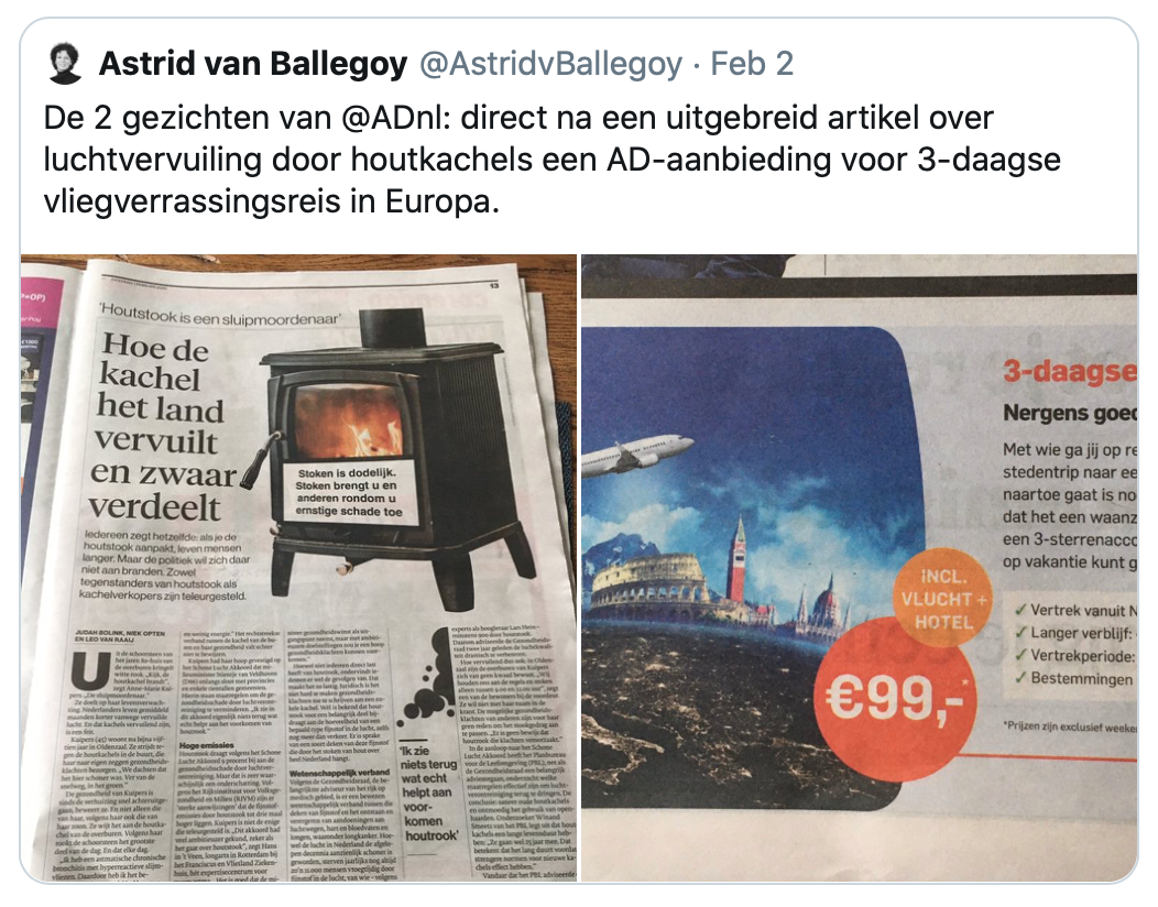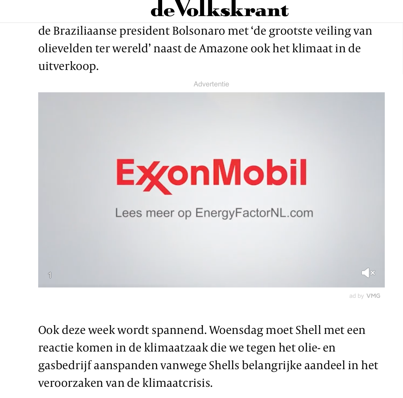 Wat: ontkrachten van journalistieke artikelen over klimaat Naast een artikel over de bosbranden van Australië staat een advertentie voor verre vliegreis. Naast een kritisch artikel over Shell, staan advertorials van Shell met een tegenovergestelde boodschap: greenwashing.