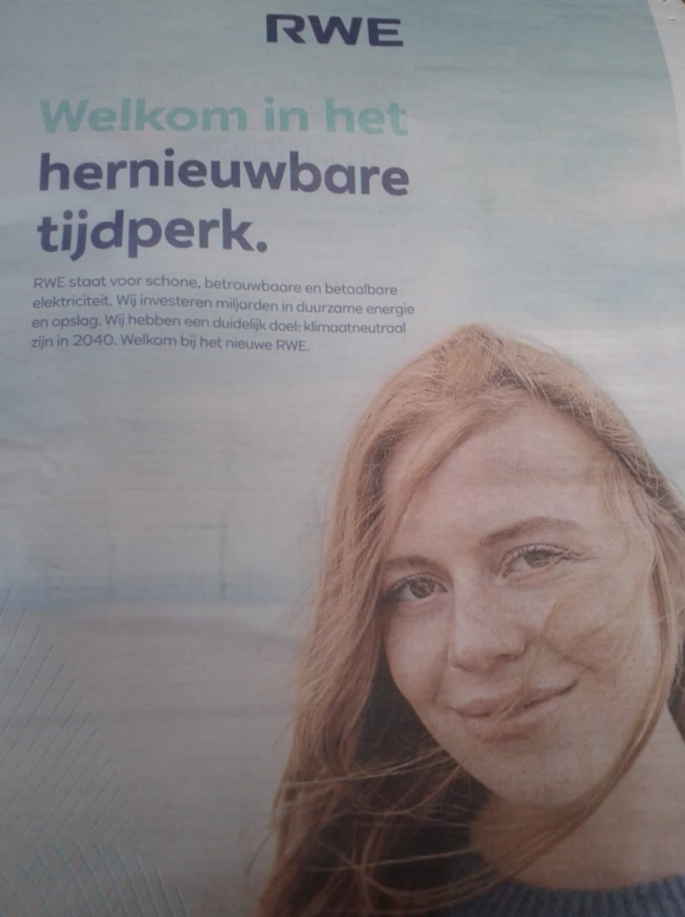 RWE is al zeker een jaar een prominente adverteerder in Nederland. In oa FD, NRC, Trouw en Vrij Nederland staat regelmatig RWE-reclame met foto’s van hondjes en meisjes met wapperende haren in de wind. In de advertenties claimt RWE in 2040 klimaatneutraal te zijn. Waarom besteedt de kolengigant zo veel geld om die boodschap uit te dragen, vaak op zeer zichtbare plekken? RWE verkoopt niets op de Nederlandse consumentenmarkt. Ook zullen weinig mensen überhaupt weten waar RWE voor staat. Dus wie en wat wil RWE met z’n advertenties bereiken?