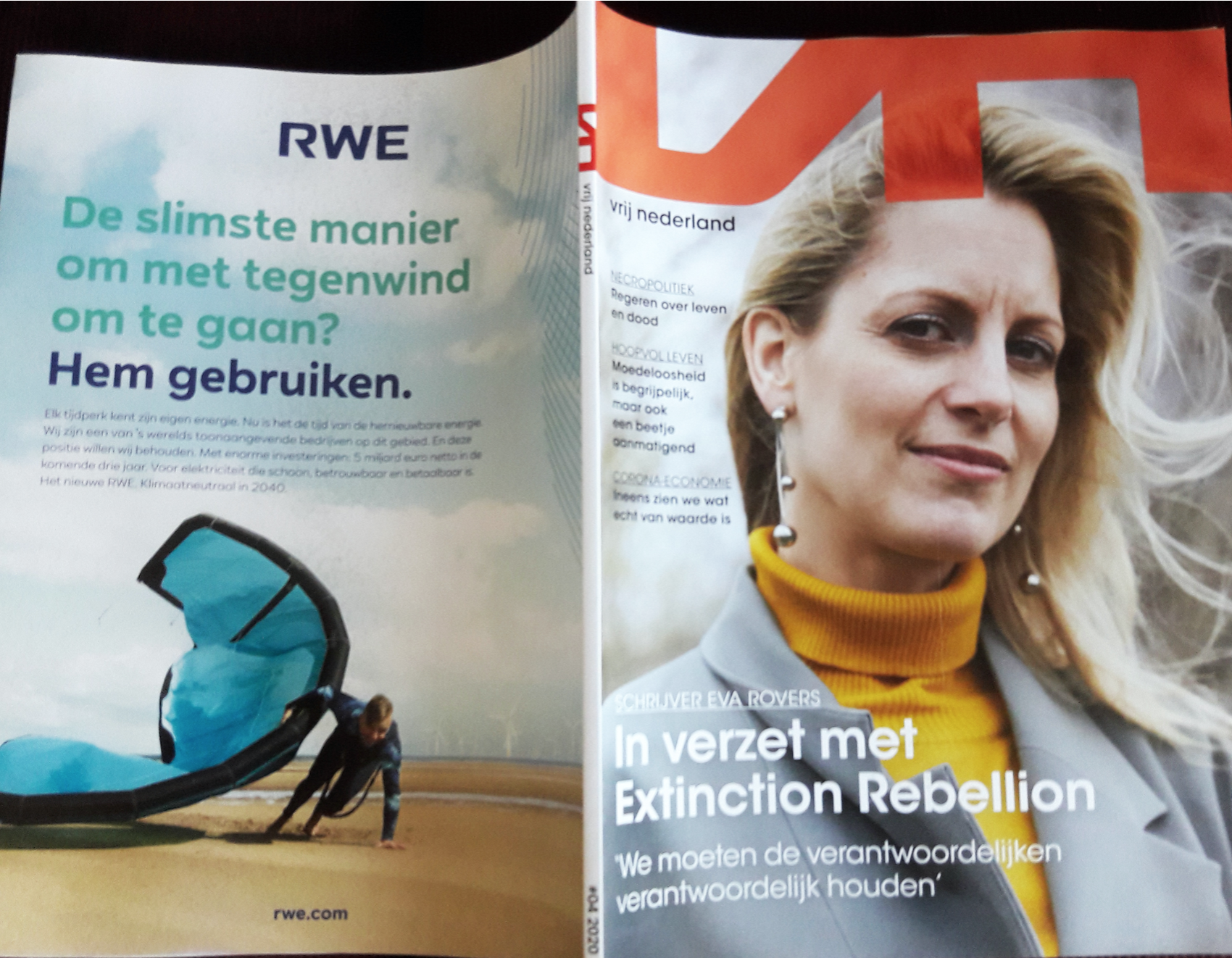 Ze schrijven: “RWE produceert nog steeds vooral elektriciteit uit kolen en heeft geen enkele nieuwe windturbine of zonnepaneel geïnstalleerd, maar alleen bestaande overgenomen.” Met veel moeite weten ze de uitgever te overtuigen om de advertentie van RWE niet te plaatsen.